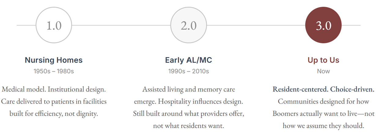 Baby Boomers won’t accept tired buildings designed for their parents. They are not looking for facilities or institutions. They want an elevated lifestyle with wellness, dignity, and community. That is why we are designing Senior Living 3.0.