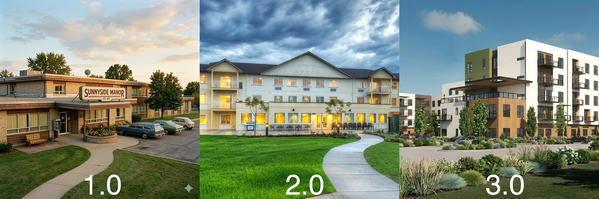 Senior Living 1.0 had been the "nursing home." But in our early years in Senior Living we successfully moved away from the old nursing home model to something much better: Independent Living, Assisted Living, and Memory Care in more human friendly home-like environments. This was a huge step-function improvement to 2.0 and those buildings are not only still popular but still being built.
